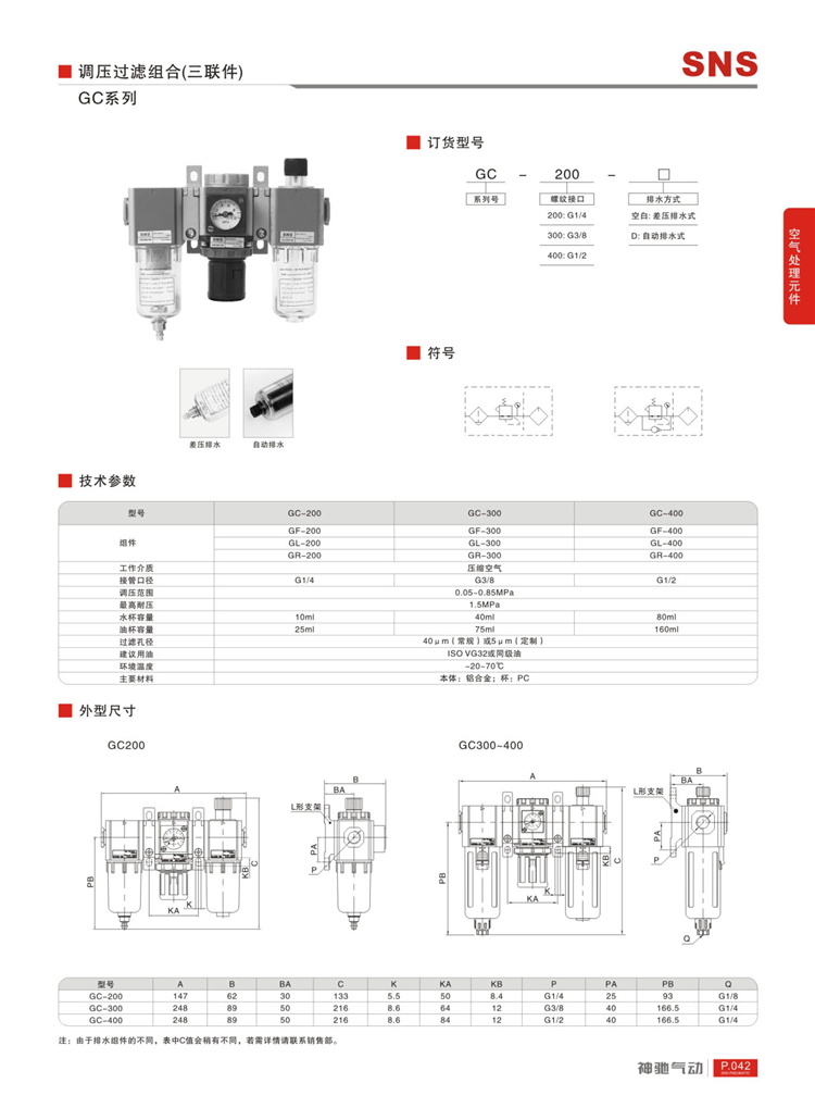 神馳氣動(dòng)GC調(diào)壓過濾組合(三聯(lián)件)技術(shù)參數(shù)