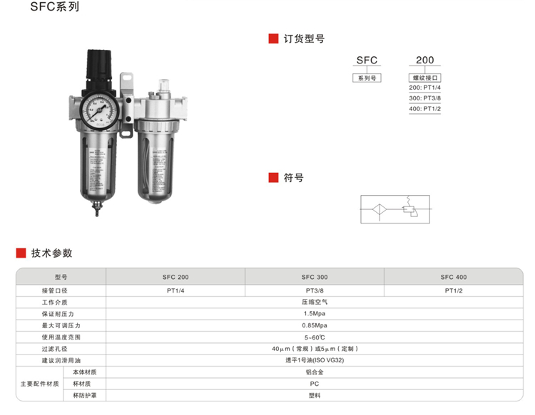 神馳氣動SFC調(diào)壓過濾器組合二聯(lián)件主要參數(shù)