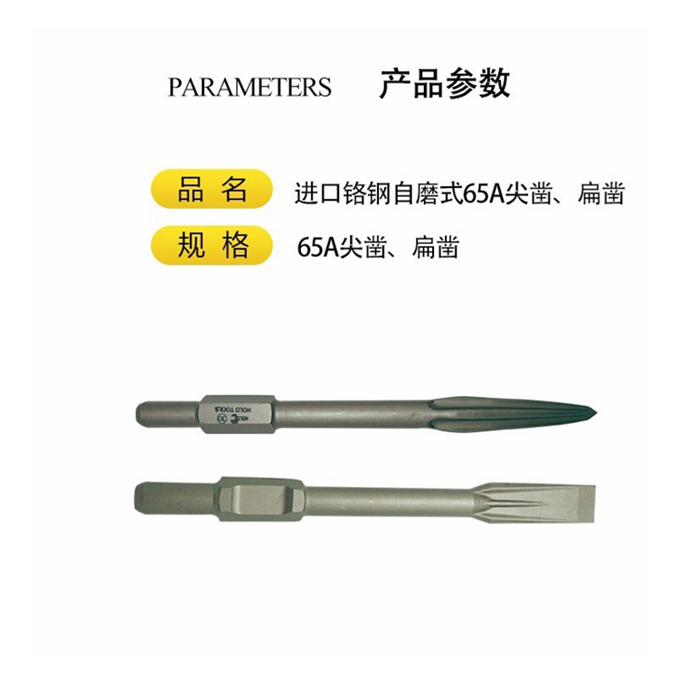 鉻鋼自磨式65A鑿子采用高溫?zé)崽幚砉に?,大大的提高了產(chǎn)品的韌性和硬度。