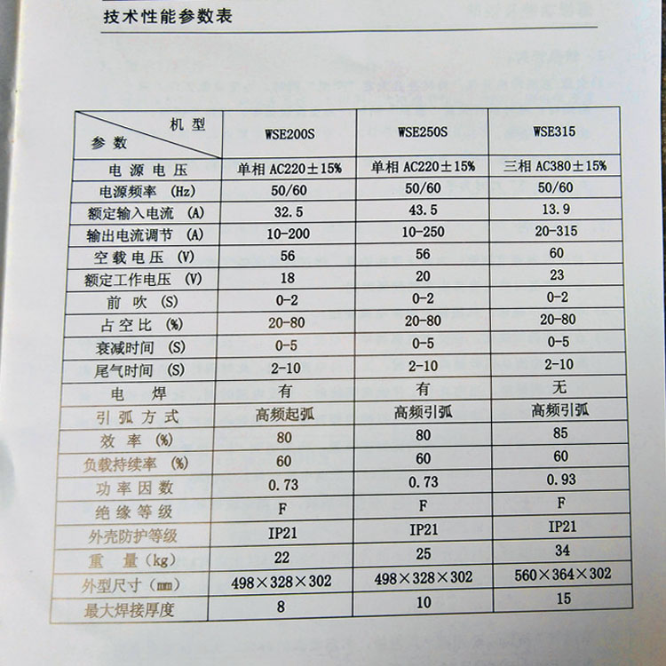 威王WSE逆變交直流氬弧參數(shù)