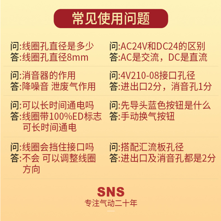 SNS神馳電磁閥各部件緊密銜接,不易漏氣,做工精致,使用壽命更長。