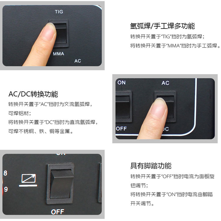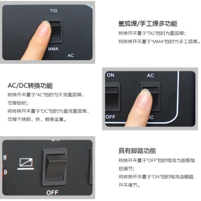 焊機(jī)具有腳踏功能,轉(zhuǎn)換開關(guān)置于“OFF”擋電流為面板旋鈕調(diào)節(jié);