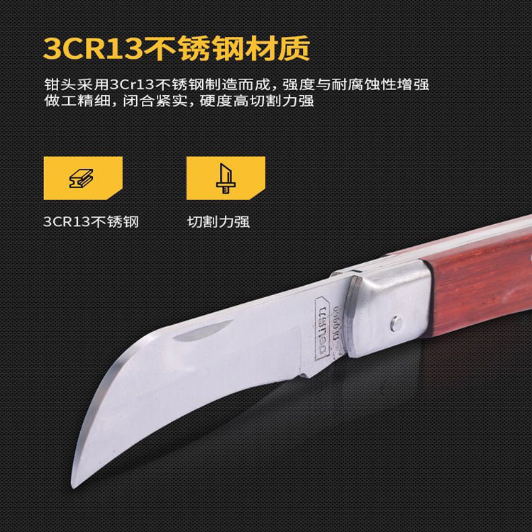 電工刀鉗頭采用3Cr13不銹鋼制造,做工精細(xì),閉合緊實(shí)
