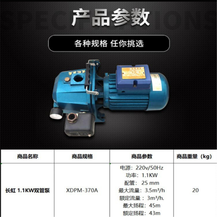 長虹1.1KW雙管泵作業(yè)效率高動力更強勁、應用范圍廣、節(jié)約低耗電、省時省力。