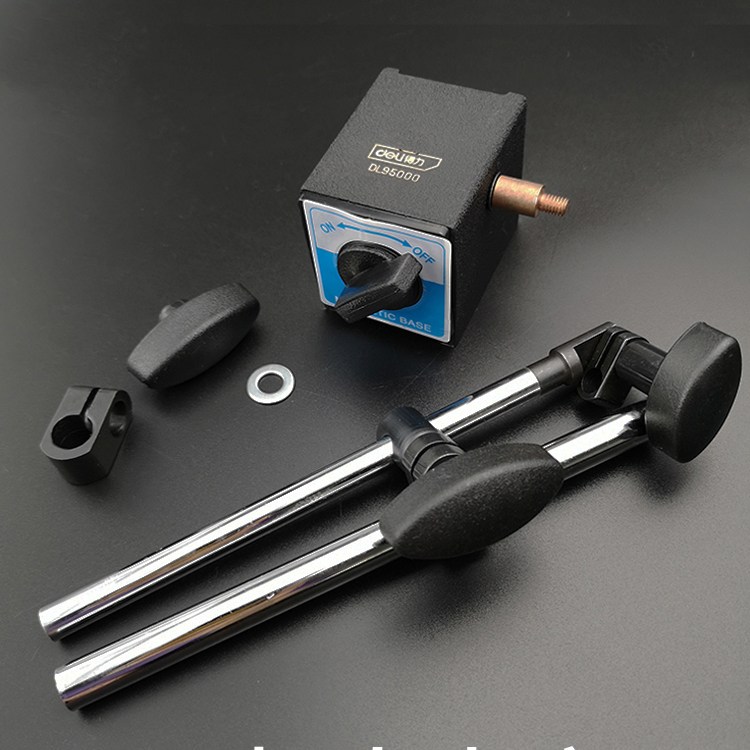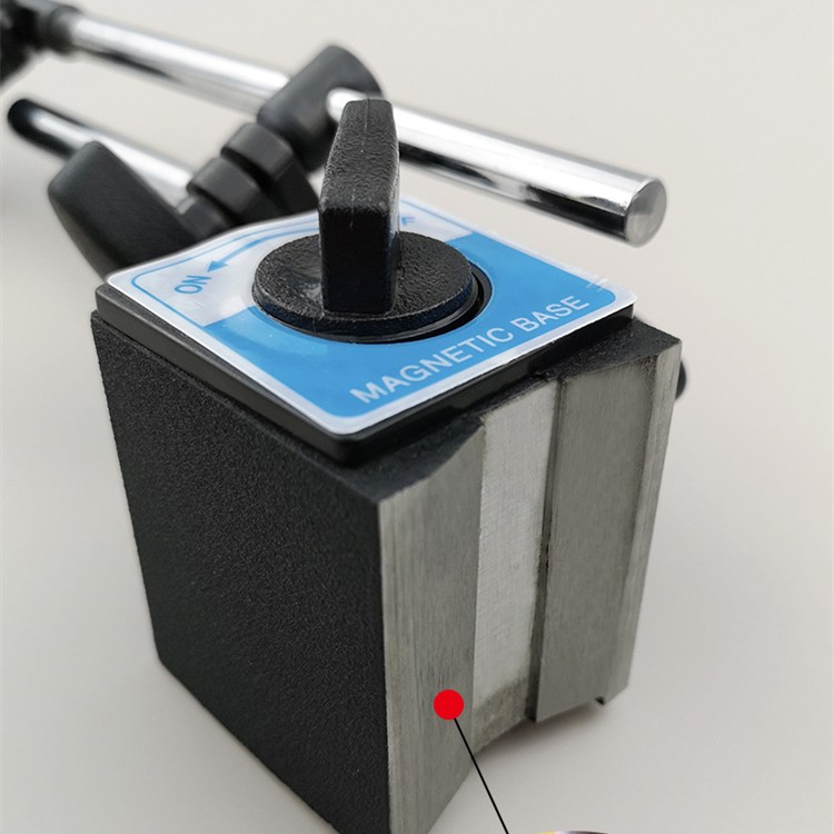 百分表架轉(zhuǎn)動開關(guān)至NO產(chǎn)生強磁,將底座牢牢吸附在鐵金屬表面