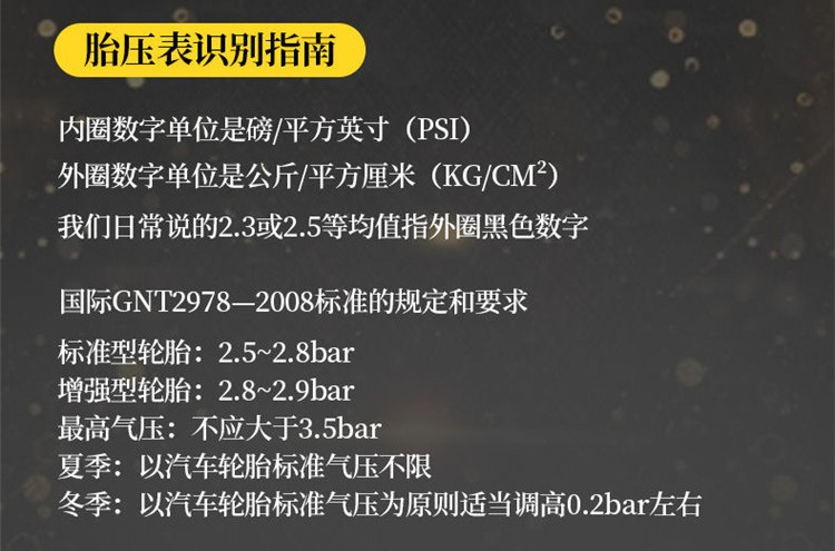 輪胎壓力表夏季胎壓值2.2-2.3bar 冬季胎壓值2.4-2.7bar