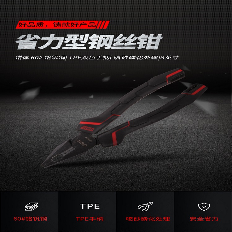 省力型鋼絲鉗采用60#鉻釩鋼精工鍛造,噴砂磷化處理,防銹效果好