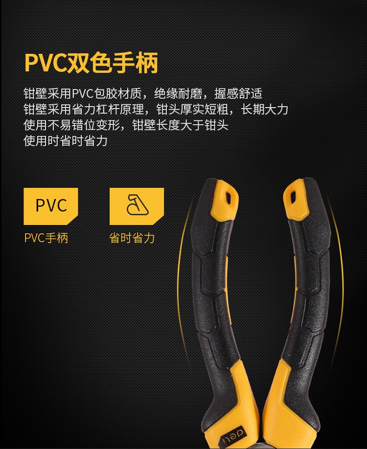 省力型鋼絲鉗環(huán)保TPE雙色手柄,外觀專利設(shè)計(jì),舒適防滑。