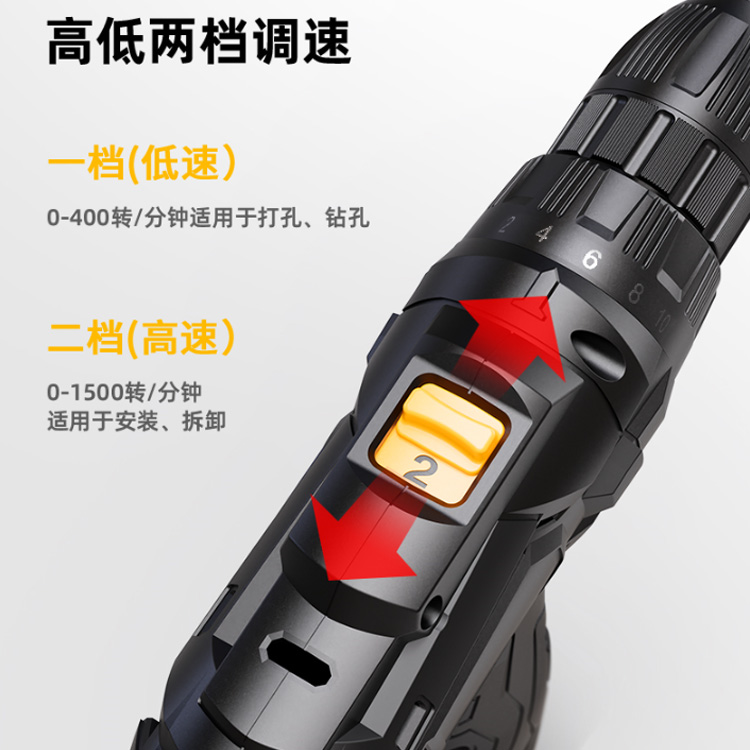 電鉆高低兩檔調(diào)速,低俗適用于大孔、鉆孔,二檔適用于安裝、拆卸