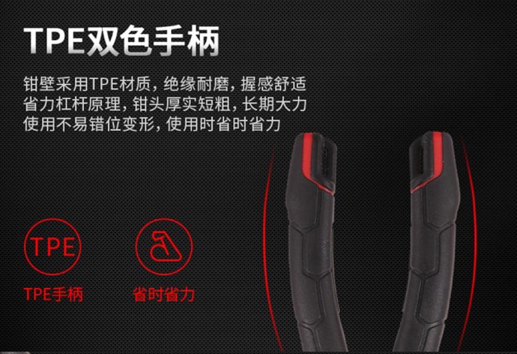 得力省力型鋼絲鉗環(huán)保TPE雙色手柄,外觀專利設計,舒適防滑。