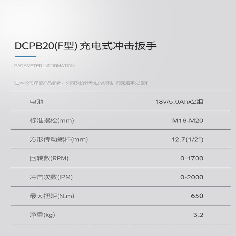 東成充電式?jīng)_擊扳手DCPB20(F型)產(chǎn)品參數(shù)