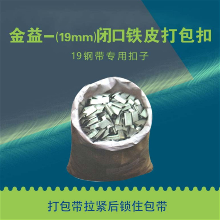 金益(19mm)閉口鐵皮打包扣,邊滑光滑無棱角,避免打包劃手和對貨物的損壞。