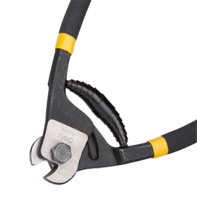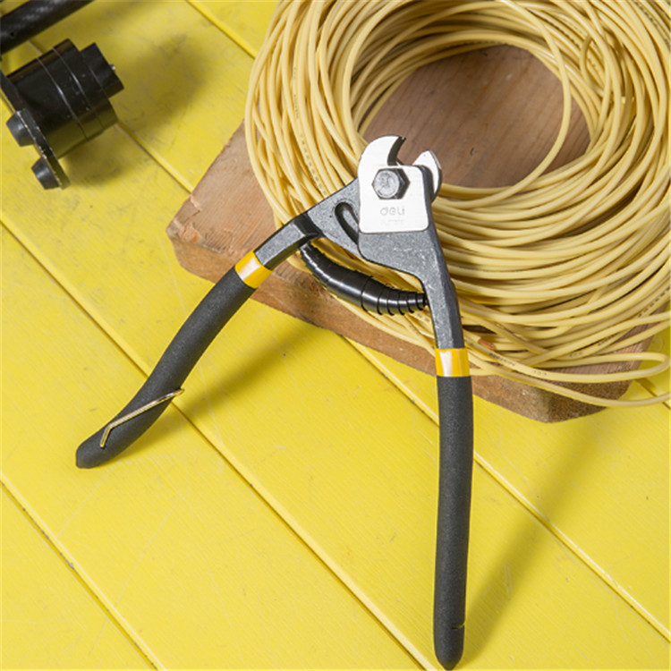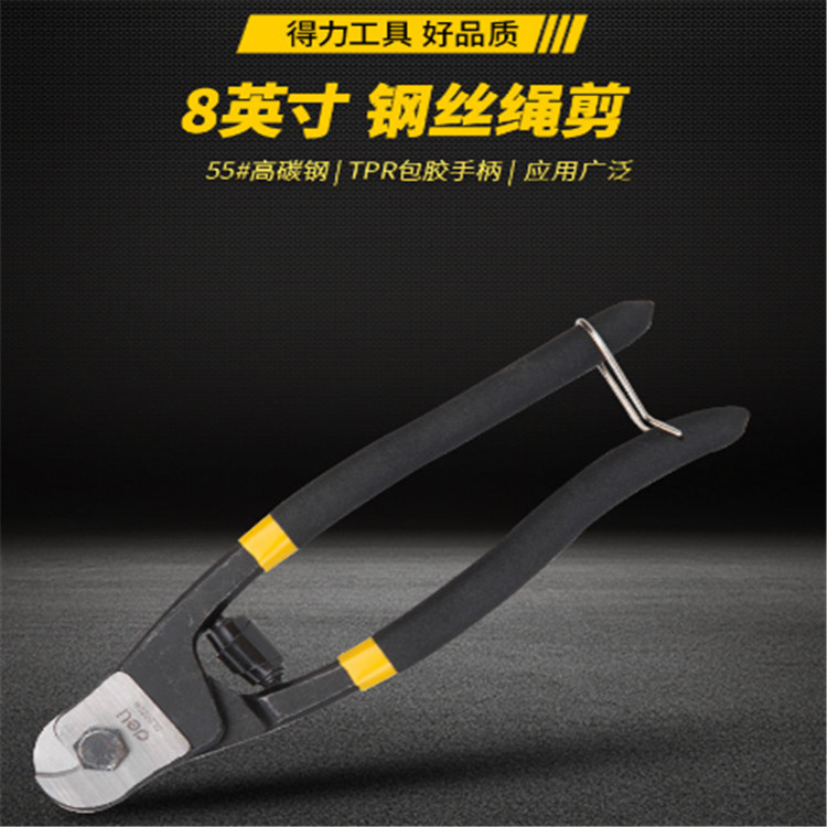得力 8寸鋼絲繩剪產(chǎn)品鉗頭采用55號(hào)鋼,表面高頻熱處理,剪切鋒利。