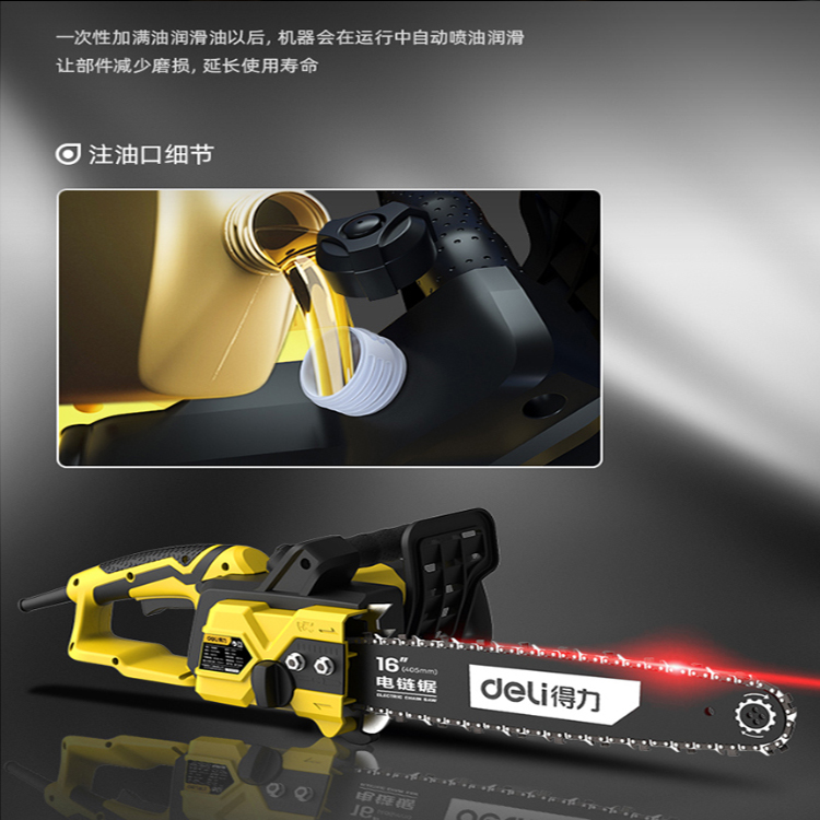 得力(deli) 大功率家用電鏈鋸自動供油,持久潤滑。