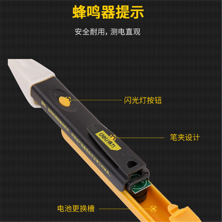 得力非接觸式測電筆感應(yīng)LED與蜂鳴器雙重報警,使用方便。