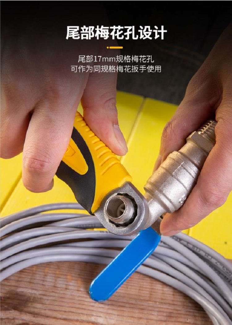 扳手尾部采用17mm規(guī)格梅花孔,可作為同規(guī)格梅花扳手使用