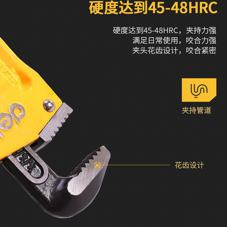 管子鉗硬度達(dá)到45-48HRC,咬合力強(qiáng),夾頭花齒設(shè)計(jì),咬合緊密
