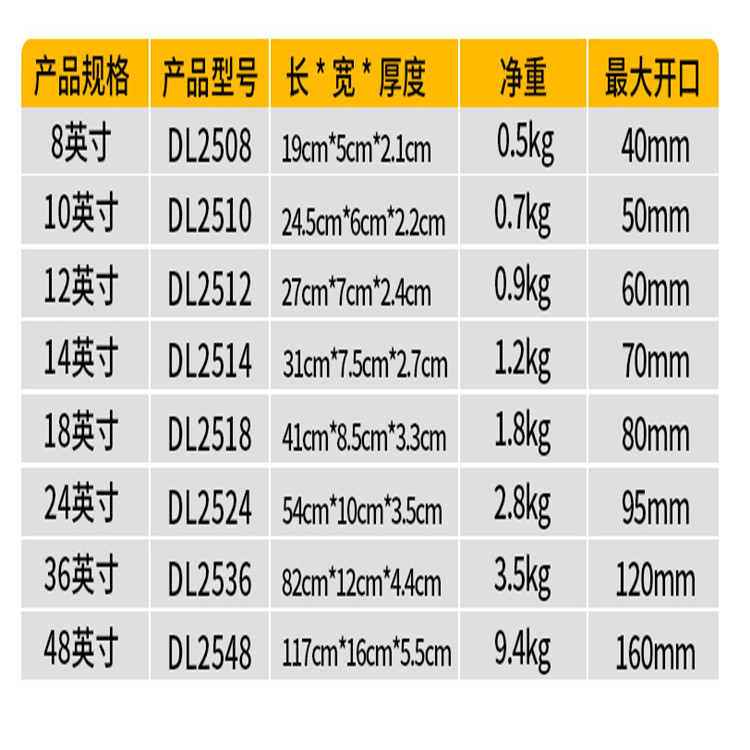 得力鋁合金管子鉗子工業(yè)級(jí)水管鉗參數(shù)