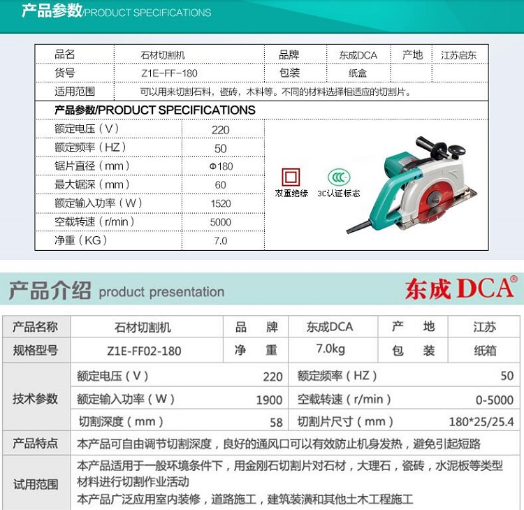 東成DCA切割機FF-180/02-180大功率云石機木材石材切割墻體開槽機