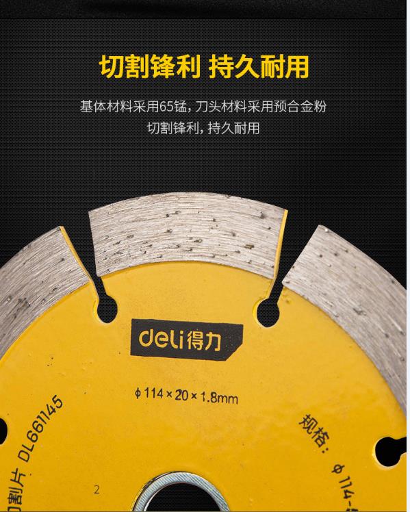 得力金剛石切割鋸片產(chǎn)品采用先進(jìn)的加工工藝,熱壓式燒結(jié),刀頭接合緊密,強(qiáng)度高。