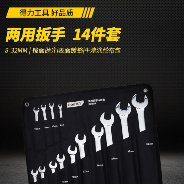 得力兩用扳手套裝14件套鏡面開口梅花扳手組套,8-32MM