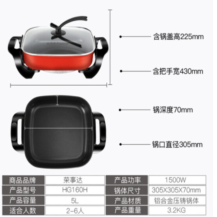 榮事達(dá)(Royalstar)電火鍋韓式家用多功能5L電煮鍋電熱鍋電炒鍋HG160H