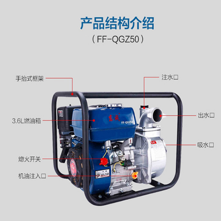 東成汽油機(jī)水泵FF-QGZ50是一種離心泵,由水泵和支架組成,成本低、