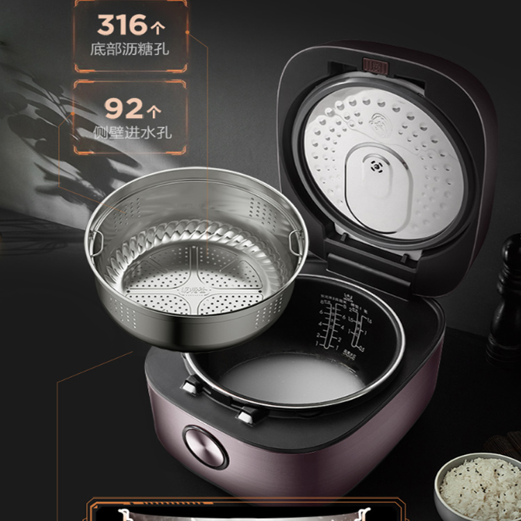 美的智能電飯煲92個側(cè)壁進水孔分布均勻,米飯平整不結(jié)塊。