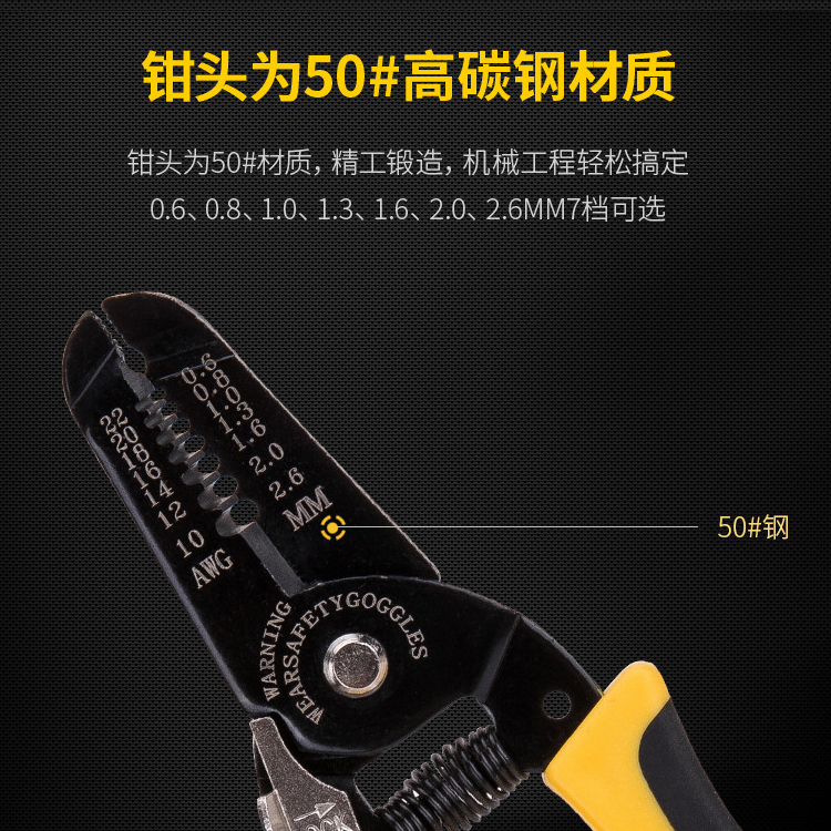 剝線鉗鉗頭為50#高碳鋼材質(zhì),精工鍛造,機械工
