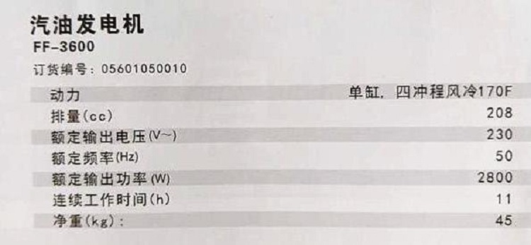 東成 汽油發(fā)電機(jī)FF-3600小型汽油發(fā)電機(jī)單相功率家用應(yīng)急發(fā)電工具基本參數(shù)