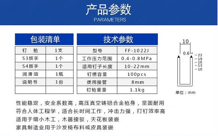 東成氣動碼釘槍FF-1022J東成槍具配備潤滑油、扳手、說明書等- 型號名稱FF-1022J
