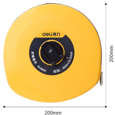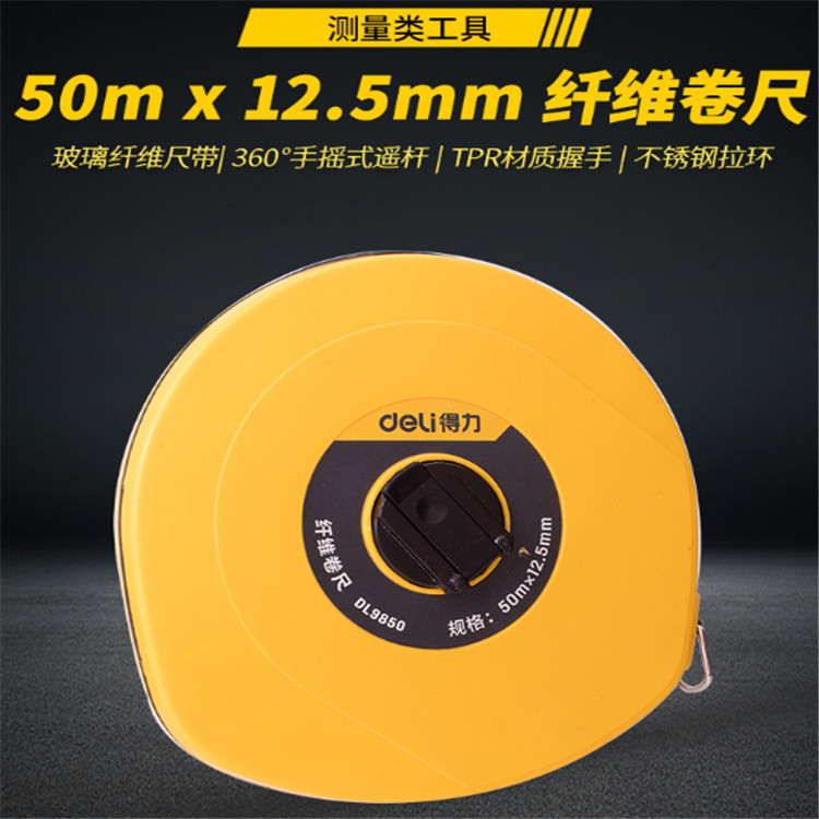 得力50米纖維卷尺玻璃纖維尺帶,抗拉伸、對折不易斷。
