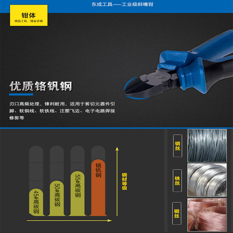 優(yōu)質(zhì)鉻釩鋼,刃口高頻處理鋒利耐用,使用于剪切元器件引腳、軟銅線、軟鐵線等。