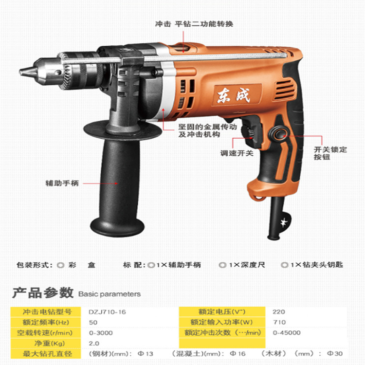 東成沖擊電鉆DZJ710-16適用于對混凝土地板、墻壁、磚塊,石料,