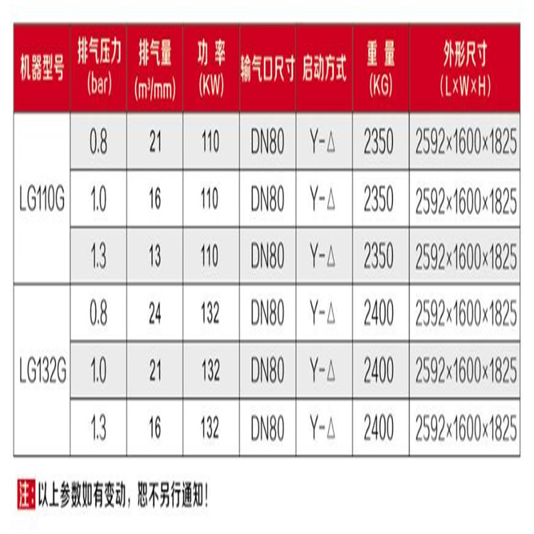 紅五環(huán)LG系列大型固定式螺桿空氣壓縮機,參數(shù)表