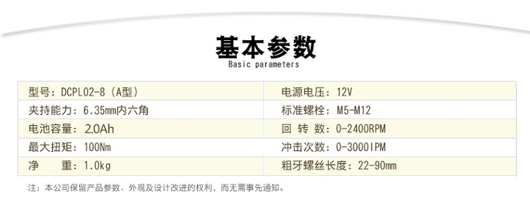 東成充電式?jīng)_擊起子機(jī)DCPL02-8E型基本參數(shù)