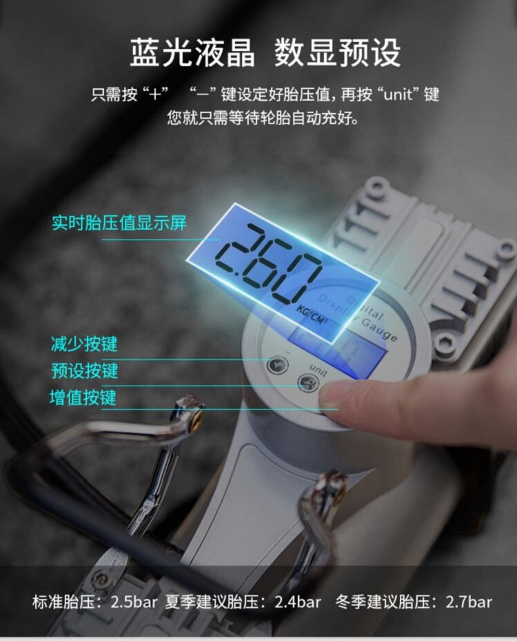 便攜式充氣泵采用藍(lán)光液晶,數(shù)顯預(yù)設(shè)