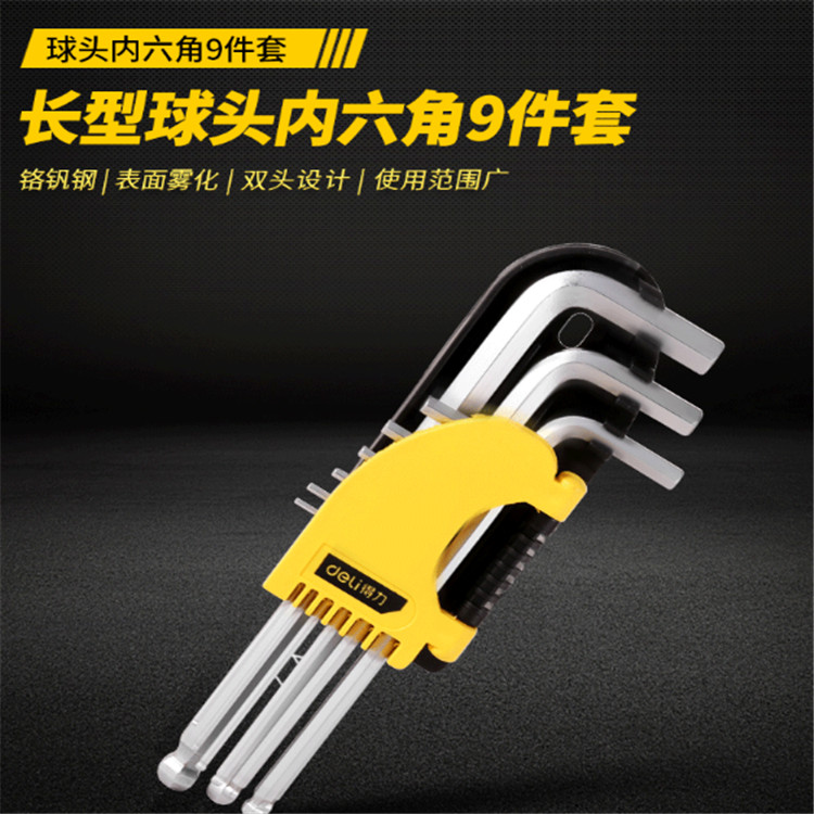 得力長型中孔花型內(nèi)六角9件套長型球頭靈活可旋轉(zhuǎn)。
