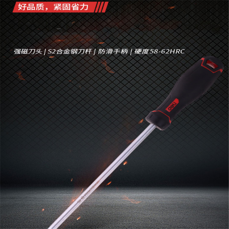 得力 S2十字螺絲批刀桿為S25鉻釩鋼整體淬火而成,硬度高,韌性好,批頭帶強(qiáng)磁。