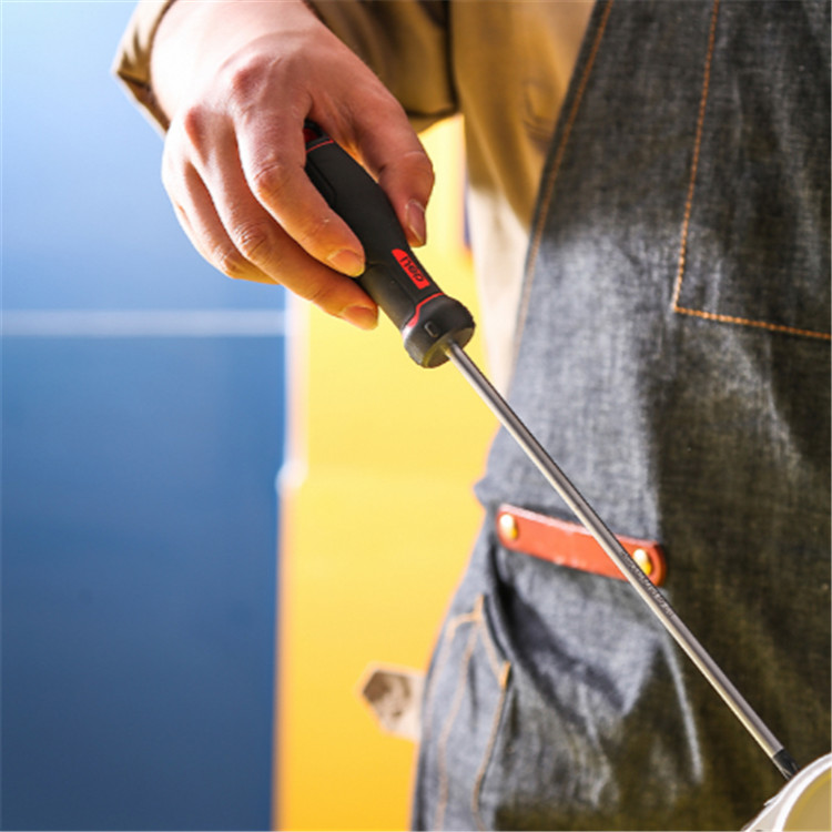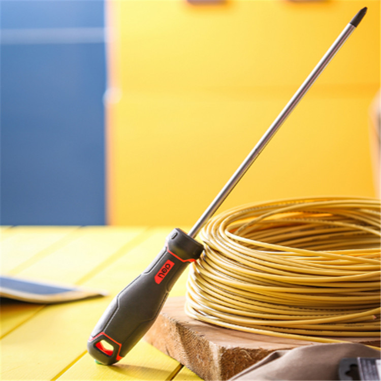 得力 S2十字螺絲批橡塑雙材料手柄,表面有精致花紋,握柄前端防轉(zhuǎn)凸點(diǎn)設(shè)計(jì)。