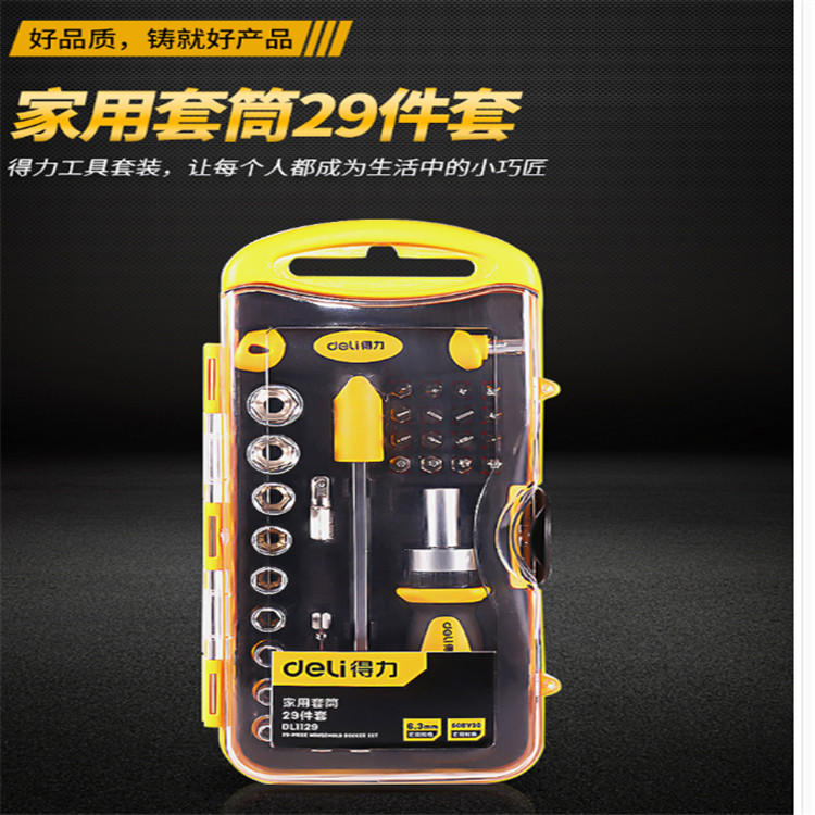 得力 家用套筒29件套三向調(diào)節(jié)高扭力棘輪,有效提高工作效率,更省力,29合一功能,一套工具應(yīng)付日常所需 。