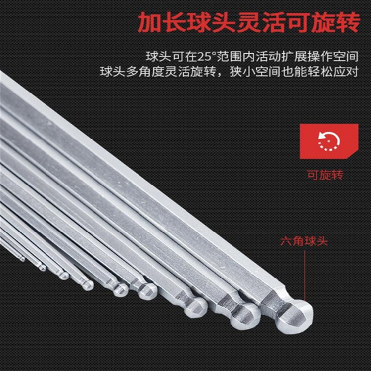得力 S2長型球頭內(nèi)六角扳手頭部球頭設計,可傾斜25°使用,有效避空。