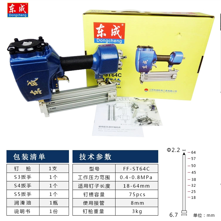 鋼釘槍FF-ST64C參數(shù):包裝清單釘槍*1、扳手S3、S4、S5順滑油、說明書