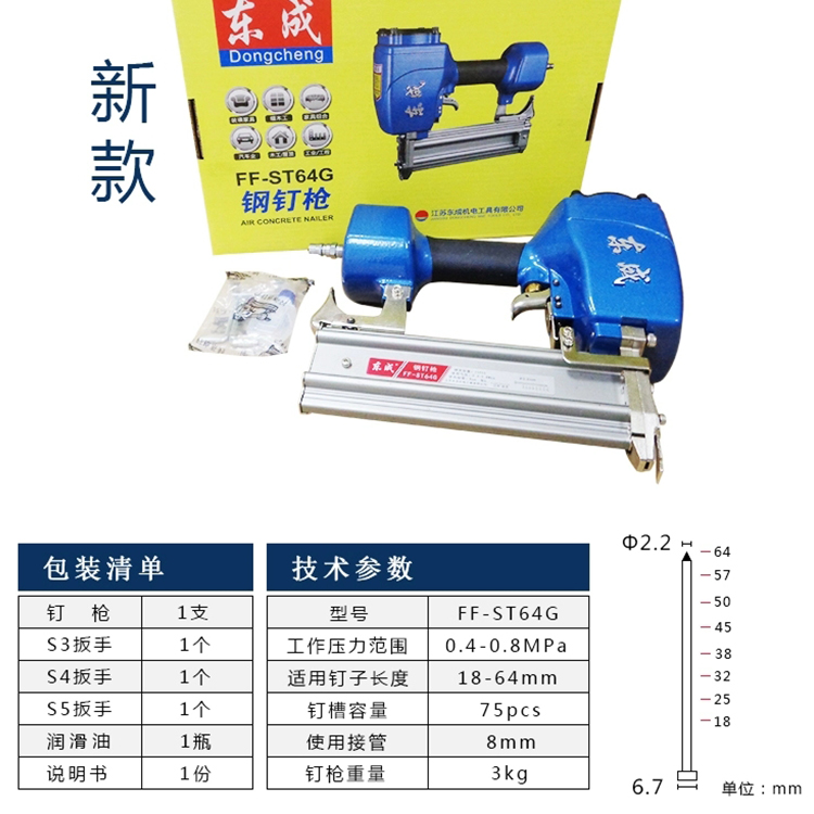 鋼釘槍FF-ST64G參數(shù):包裝清單釘槍*1、扳手S3、S4、S5順滑油、說明書