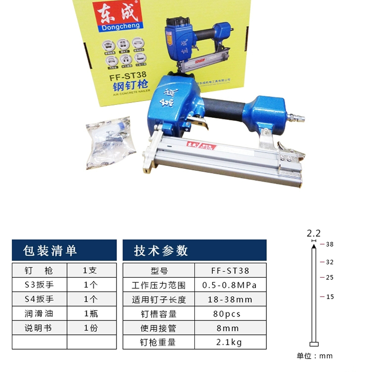 鋼釘槍FF-ST38參數(shù):包裝清單釘槍*1、扳手S3、S4、S5順滑油、說明書