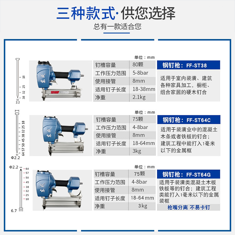 鋼釘槍三款型號參數(shù):FF-ST38/FFF-ST64C/FFF-ST64G