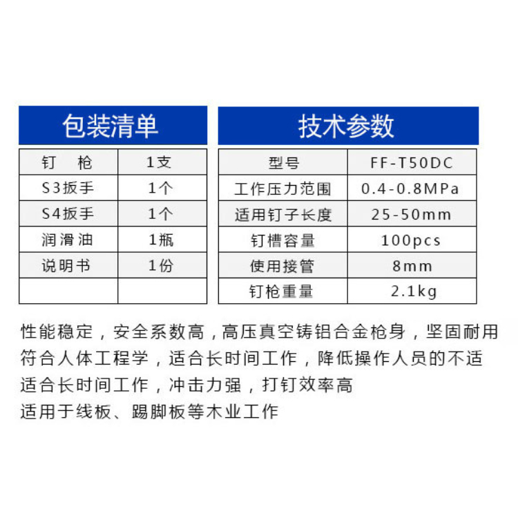 東成氣動(dòng)直釘槍FF-T50DC不易卡釘,高速便捷