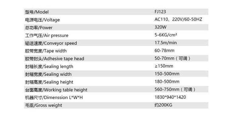 FJ123全自動(dòng)上左右驅(qū)動(dòng)封箱機(jī) 全自動(dòng)膠帶封箱機(jī) 紙箱封箱機(jī) 產(chǎn)品參數(shù)圖