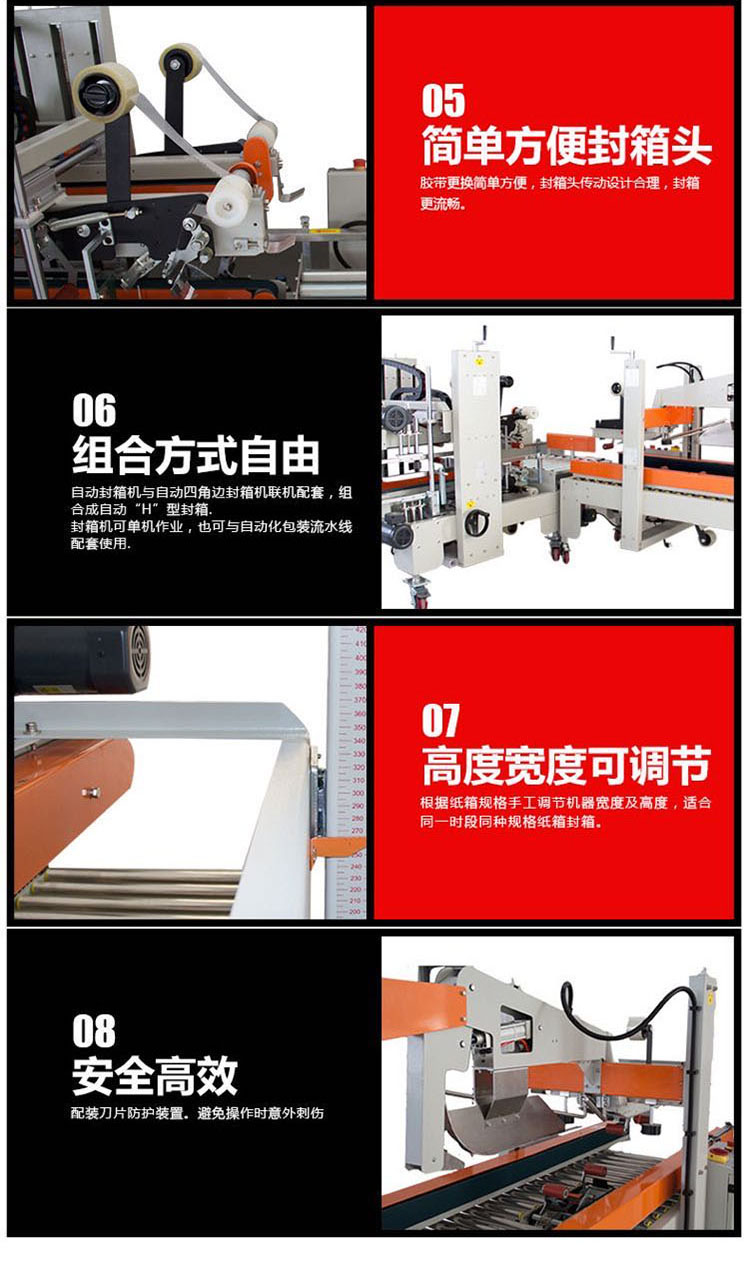 全自動(dòng)上左右驅(qū)動(dòng)封箱機(jī)可根據(jù)不同紙箱規(guī)格,自動(dòng)調(diào)節(jié)寬度及高度,操作方便、簡(jiǎn)單、快速。