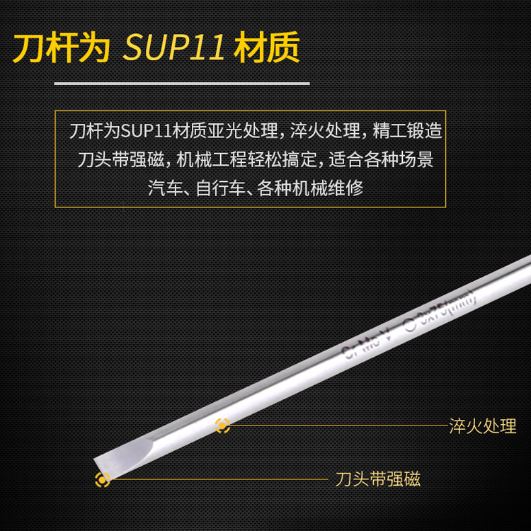 螺絲刀刀桿為SUP11材質(zhì)亞光處理,淬火處理,精工鍛造